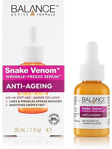 سرم سم مار و کلاژن محصولی از برند ساخت کشور انگلیس بالانس می باشد. این سرم حاوی کلاژن دریایی و ۴% SYN-AKE میباشد که یک پپتید ضد پیری بسیار قوی است. توجه کنید که این سرم فاقد سم مار است و Snake Venom فقط اسم تجاری این محصول است. سرم سم مار بالانس یکی از قویترین ضدپیریهای این برند است که تاثیر مستقیم روی درمان چروک و افتادگیهای پوست میگذارد.