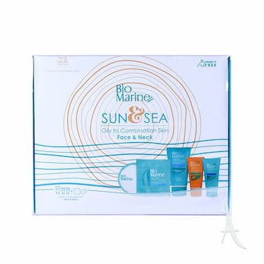 کیت خورشید و دریا بایومارین مخصوص پوست های چرب و جوشدار حاوی عصاره جلبک دریایی شامل ماسک صورت،کرم ضدآفتاب فاقد چربی spf 50،ژل شستشوی صورت و فلوئید رطوبت رسان و مات کننده پوست