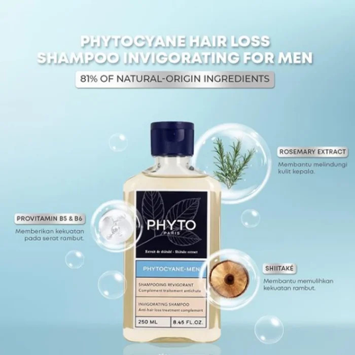شامپو ضد ریزش فیتو تقویت کننده مو Phytocyane men حاوی جینسینگ، عصاره کینا، عصاره رویباس، ویتامین B3 ، عصاره مریم گلی و زینک می باشد.و با افزایش تبادل سلولی و گردش خون مویرگی باعث محافظت از بافت همبند پباز مو شده. و با افزایش ملانین سازی از سفیدی موها جلوگیری می کند.