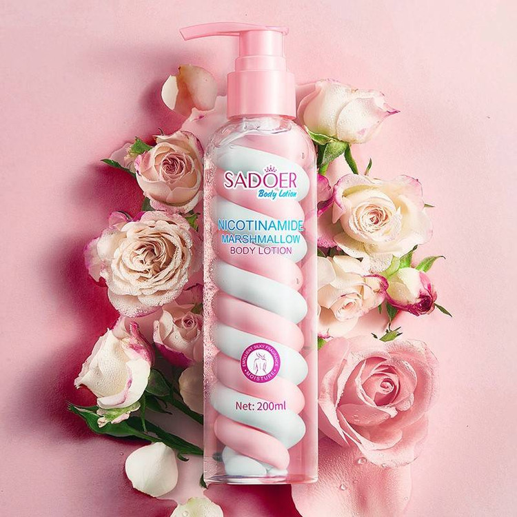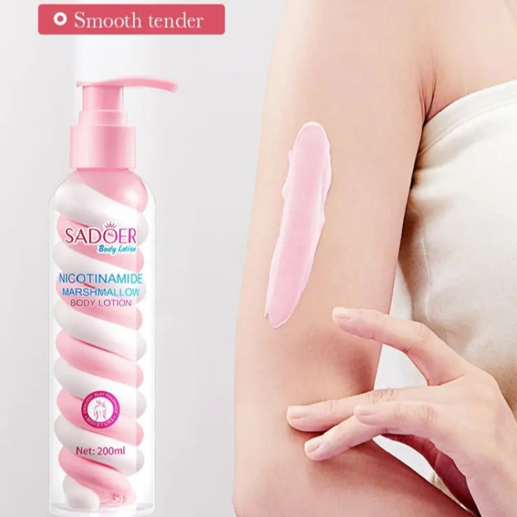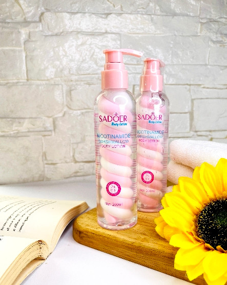 لوسیون بدن مارشمالو شیشه ای سادور SADOER مدل صورتی حاوی نیاسینامید و نیکوتینامید حجم ۲۰۰ میل